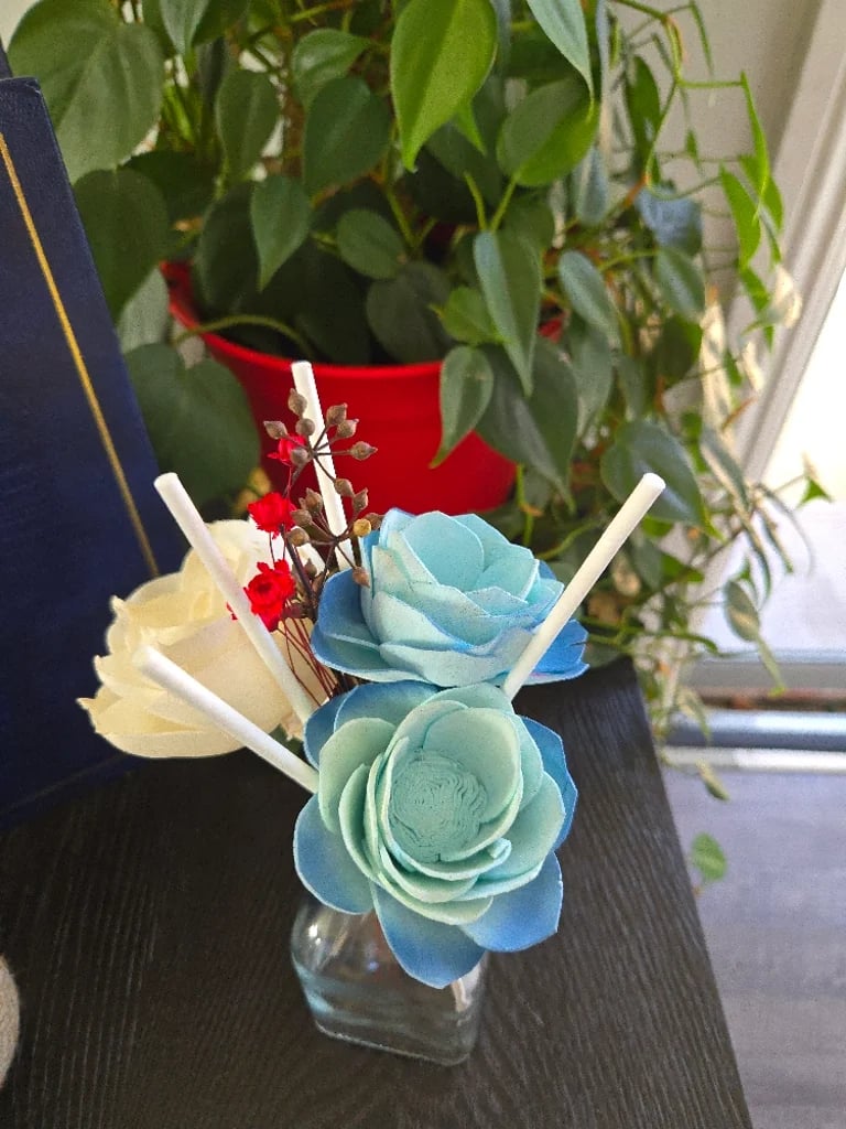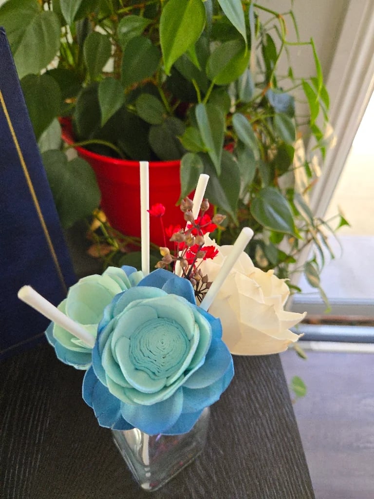 This set comes with a roped white rose, 2 blue poppies, set with preserved eucalyptus seeds, red star flowers and several white reed sticks. ✨️