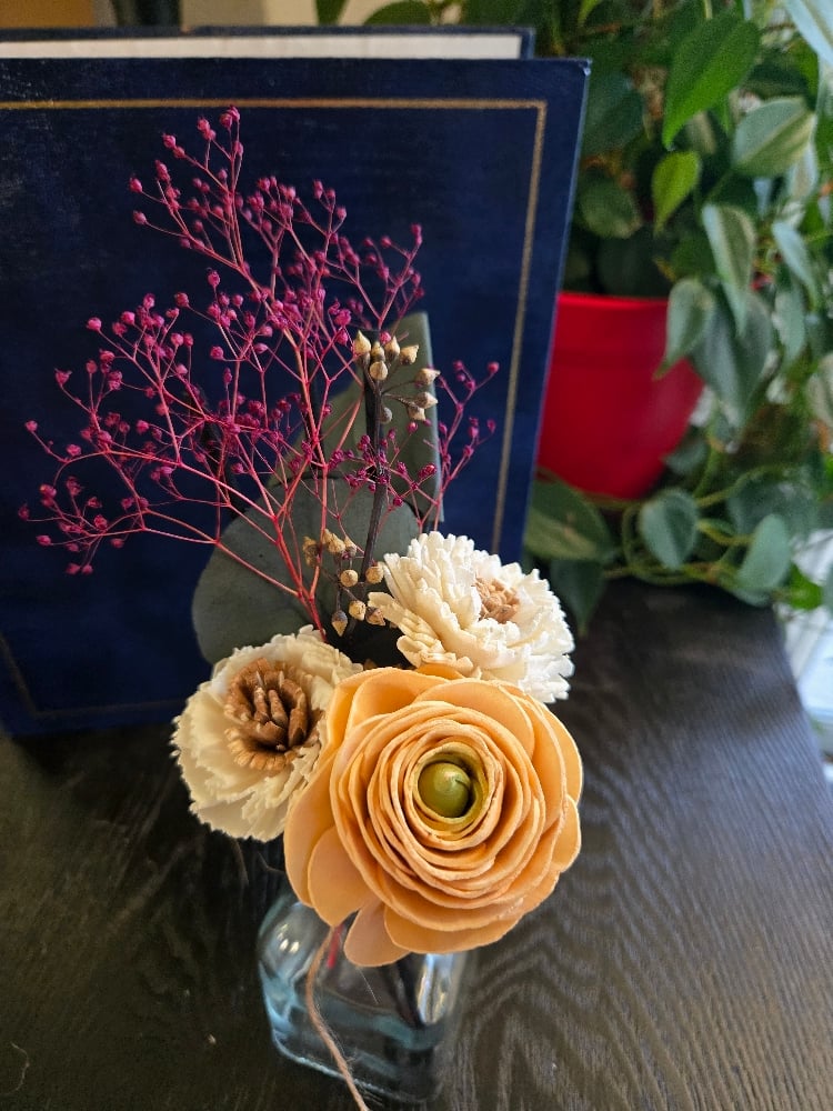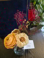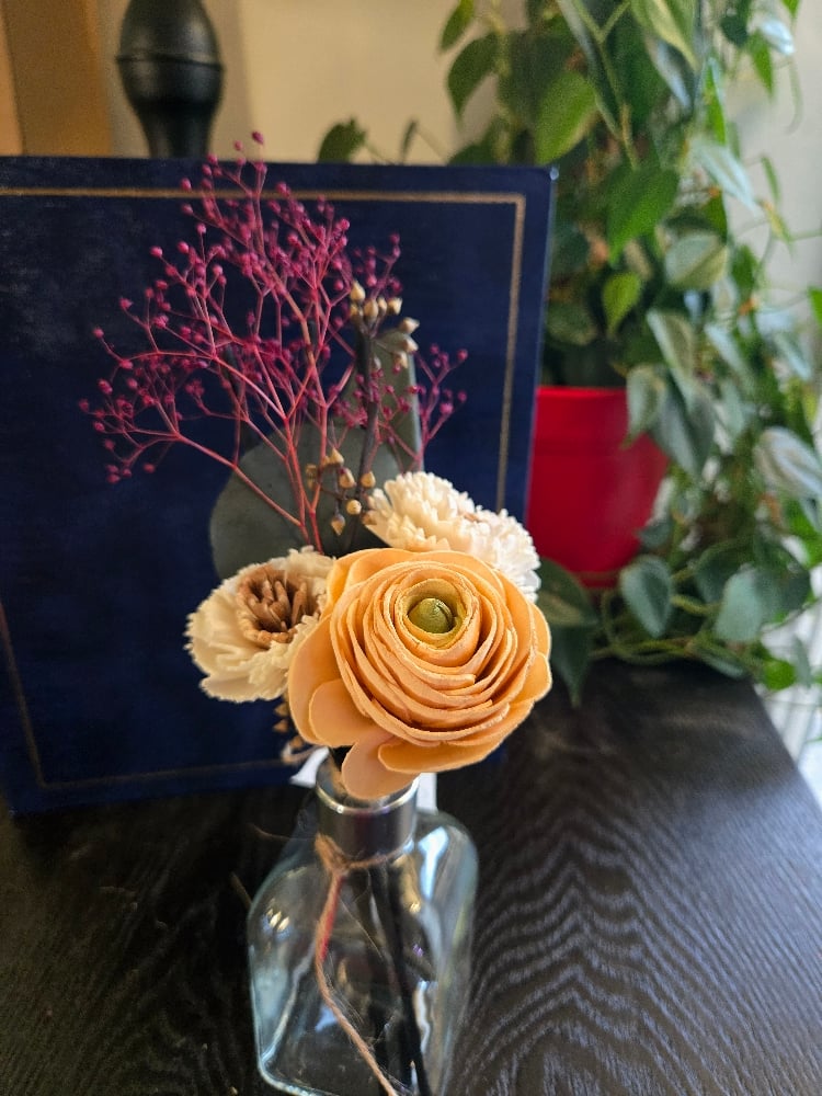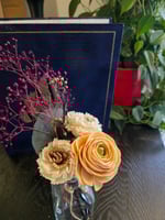 A light orange rose with a light green center combined with 2 white carnations with a brown center 💛 Set with preserved purple babys breath, seeded eucalyptus pods, eucalyptus leaves and several black reed sticks! ✨️An adorable set that would look great in your home or office!