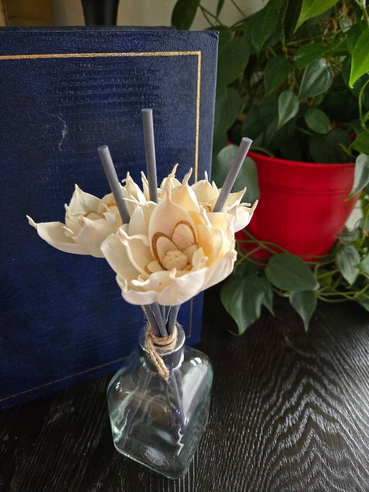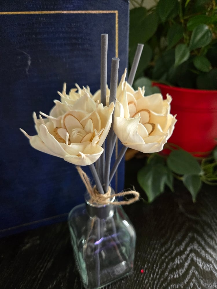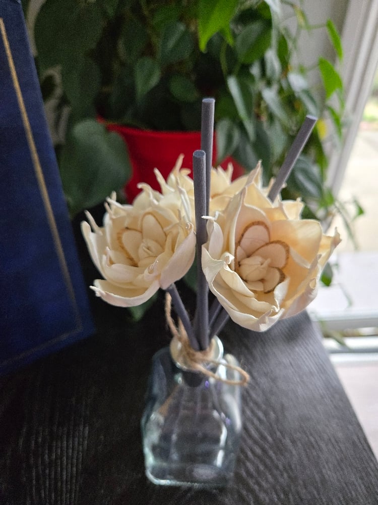 A simple bouquet of 3 flowers with a nice wood contrast. Set with several gray reed sticks.