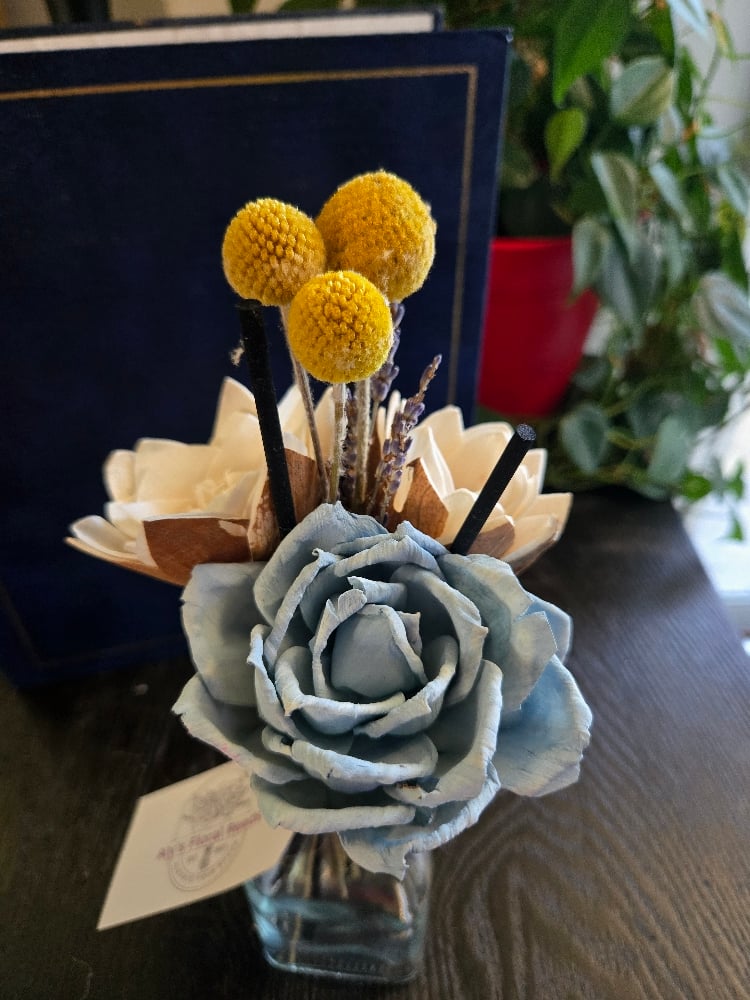 A large blue rose combined with 2 wooden water lilys, set with preserved yellow billy buttons, lavendar and as always with several black reed sticks. Act Fast, This one wont last long! ✨️An adorable set that would look great in your home or office!
