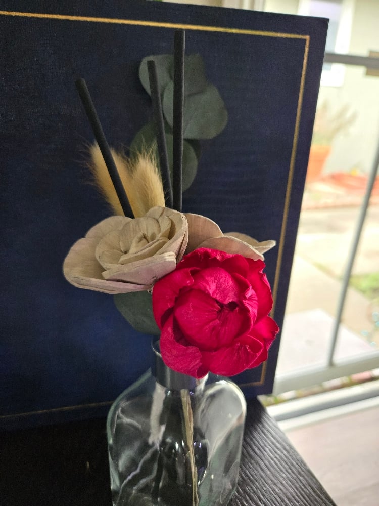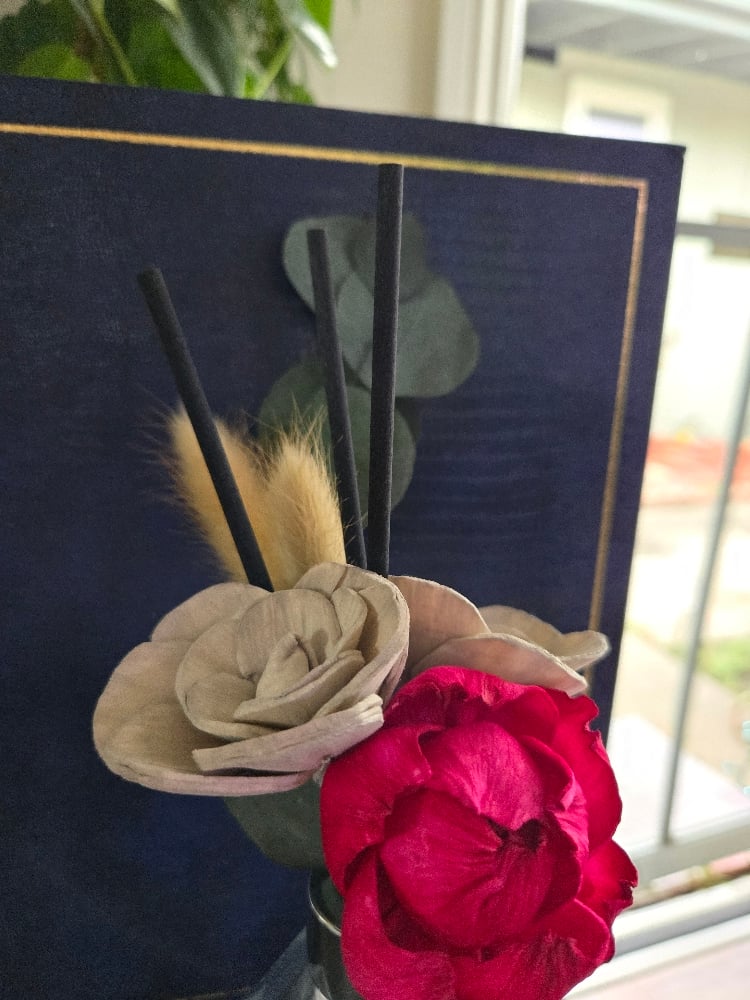 This set comes with a roped red flower and 2 gray flowers, set with preserved eucalyptus, bunny tails and several black reed sticks ✨️