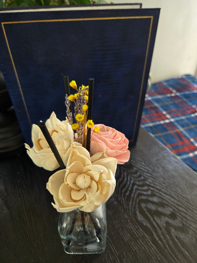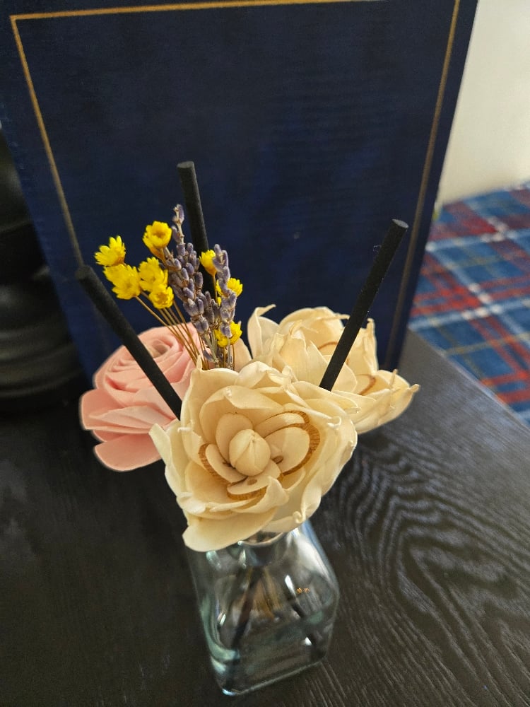 This beautiful rose set comes with a large 3 inch pink rose with a slight purple center, 2 smaller cream "almond sliced center" flowers. Set with preserved lavendar, yellow star flowers and several black reed sticks. A beautiful set that would look great sitting in your windows or bathroom!