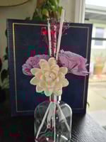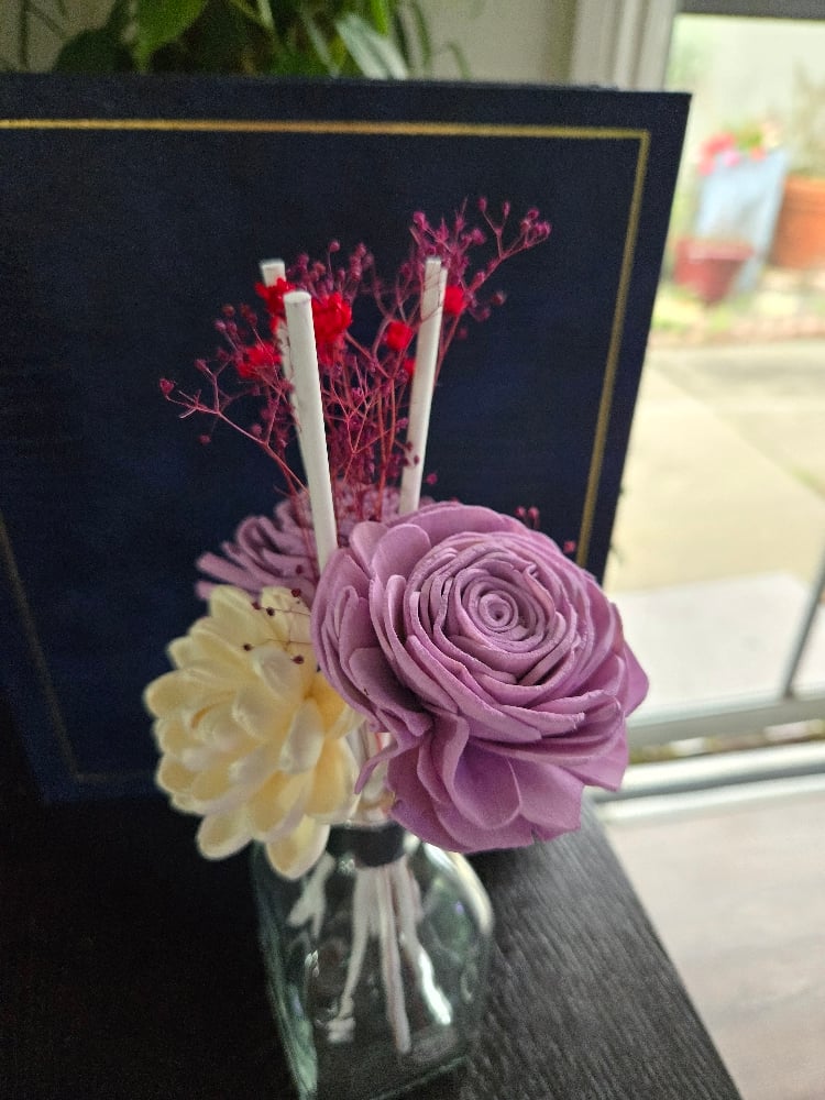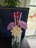 This set comes with a roped white crown jewel, 2 large purple roses, preserved red star flowers, ultra tiny purple flowers and several white reed sticks. ✨️