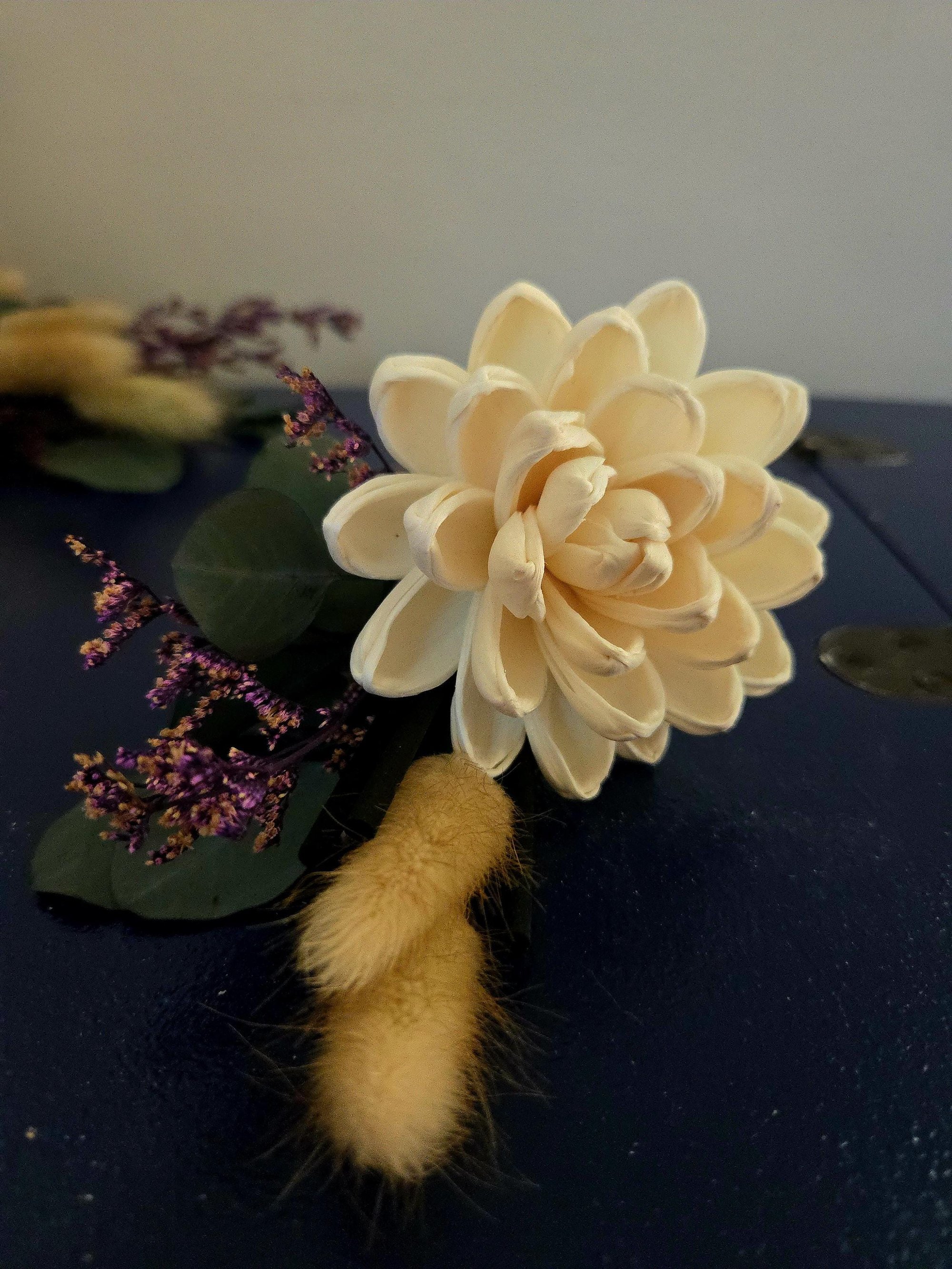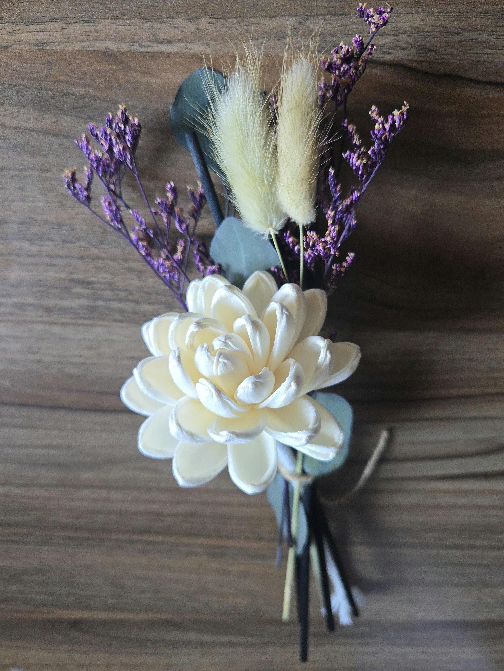 Beautiful crowned flower set with preserved eucalyptus, purple Caspia, bunny tails and several reed sticks. This looks beautiful anywhere in your home or office!