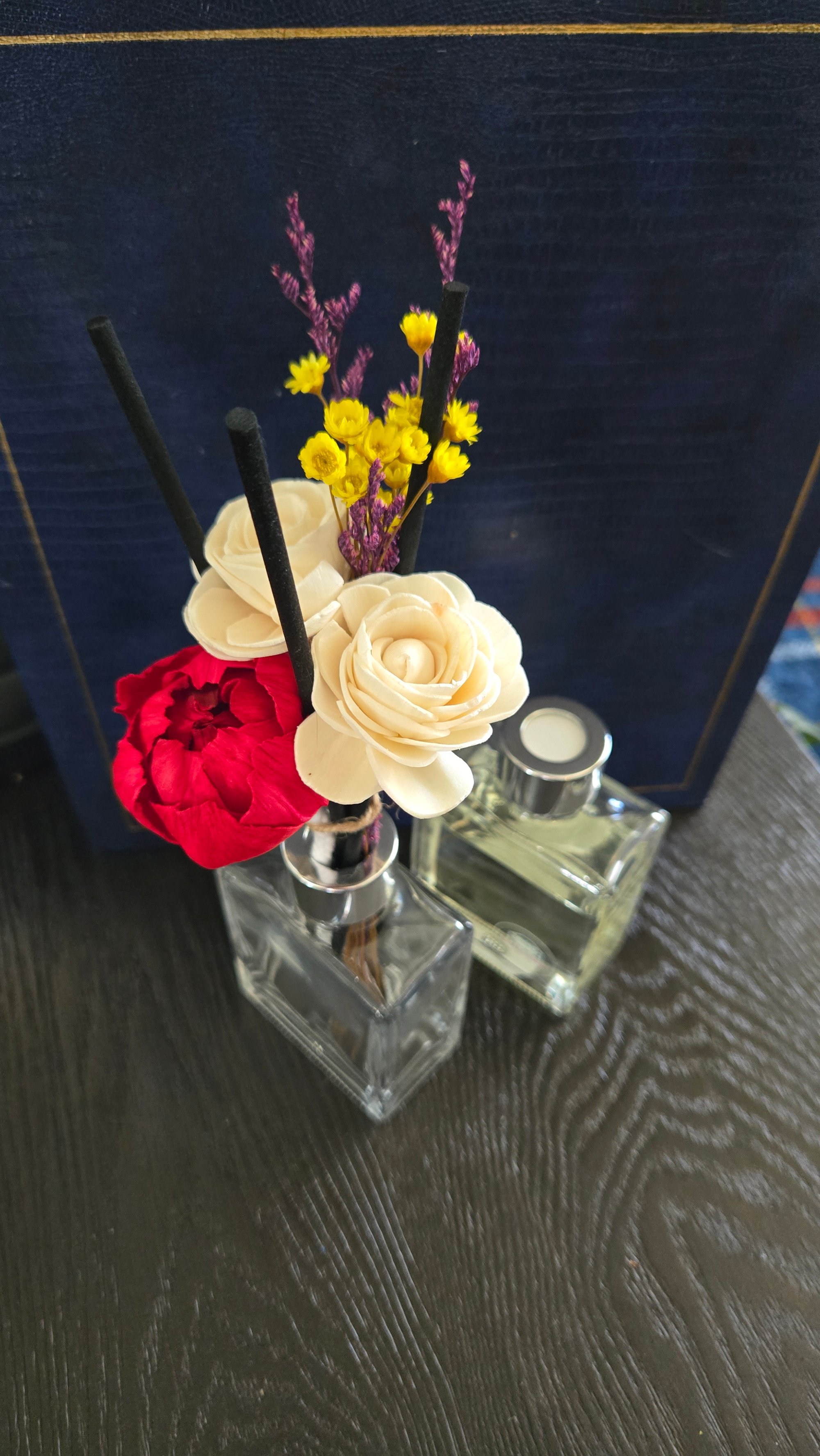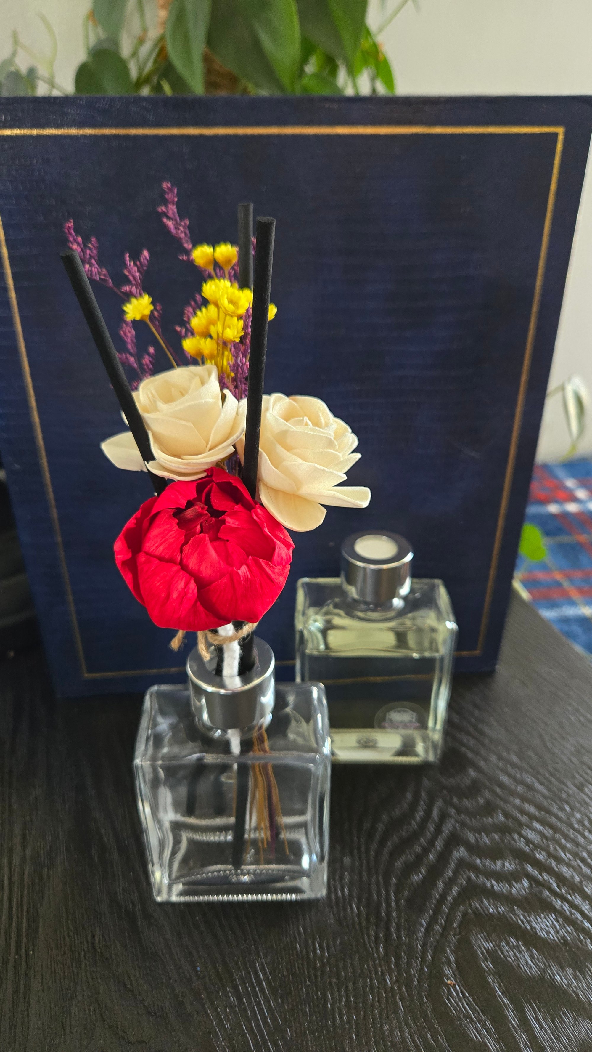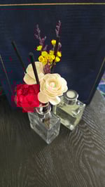 My dainty collection is absolutely beautiful! This one comes with a 2 inch roped red peony flower, 2 white flowers, set with preserved yellow star flowers, purple caspia and several black reed sticks. I recommend that they come with the new square jar to keep the elegant polished look. This bouquet is a one of a kind, act fast! 💕