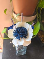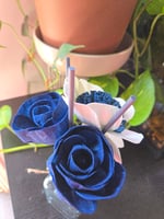 This bouquet comes with a large white white and blue poppy flower, 2 dark blue roses and several gray reed sticks. This is so beautiful!