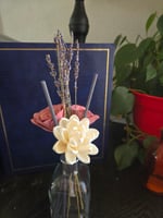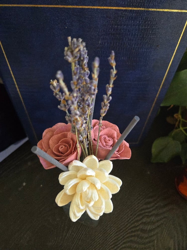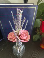This bouquet comes with a large white crown roped flower, 2 wine colored roses dried lavender and several gray reed sticks. This is so beautiful!