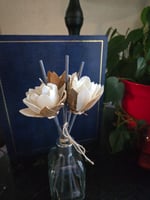 A simple bouquet of 3 flowers with a nice wood contrast. Set with several gray reed sticks.