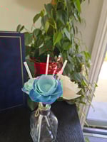 This set comes with a roped white rose, 2 blue poppies, set with preserved eucalyptus seeds, red star flowers and several white reed sticks. ✨️