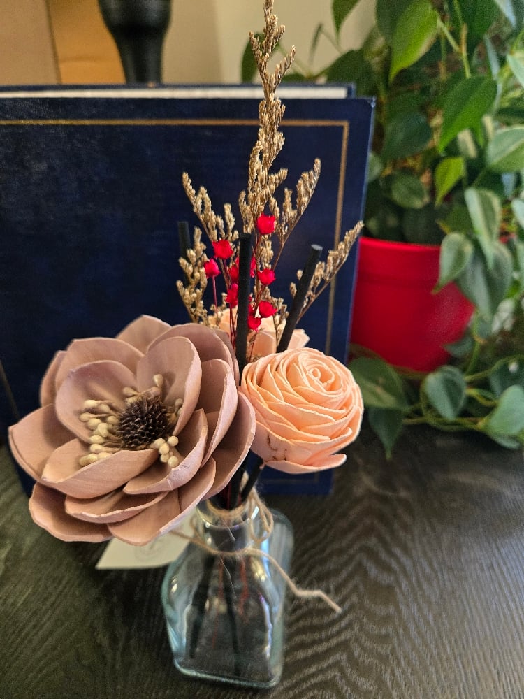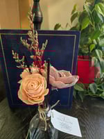 This set comes with a beautiful mauve flower with faux pearls set in the center, set with 2 cream roses, preserved red star flowers, caspia and several black reed sticks ✨️