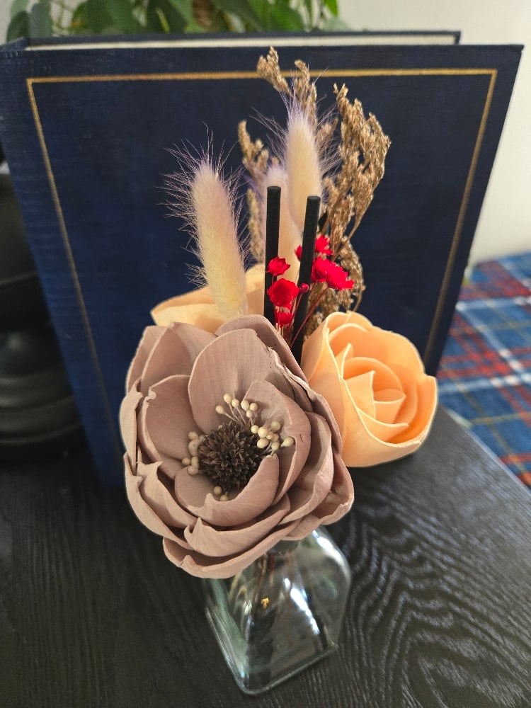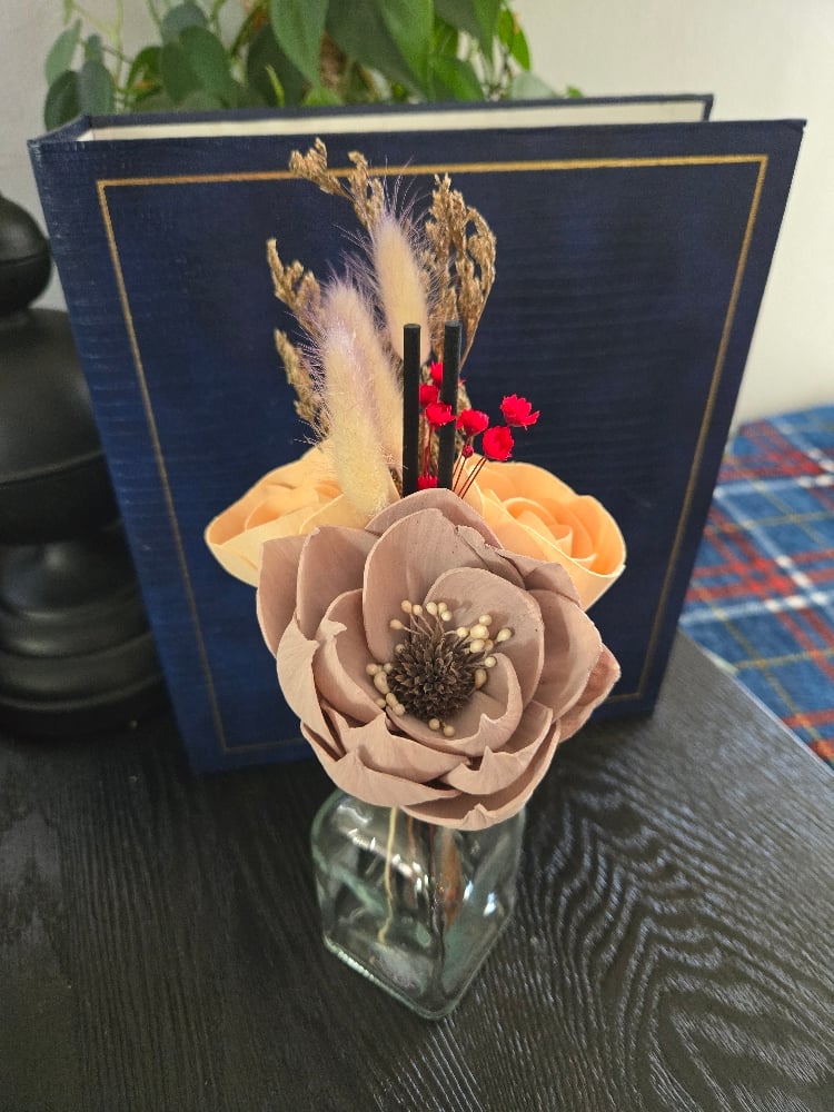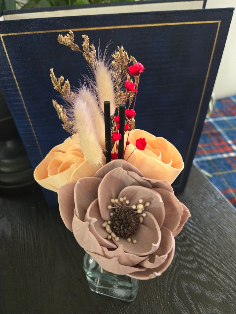 A lovely large mauve passion flower with beaded stamens, set with 2 peach roses, preserved bunny tails, brown caspia, red star flowers and several black reed sticks. This set is elegant and would look beautiful anywhere you place it. Gift this beauty to yourself or a loved one. There is only 1 available and won't last long! 💕