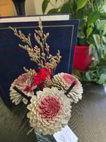 This crazy zinnia set comes with 3 gray and red flowers, set with preserved caspia, red star flowers and several reed sticks.✨️