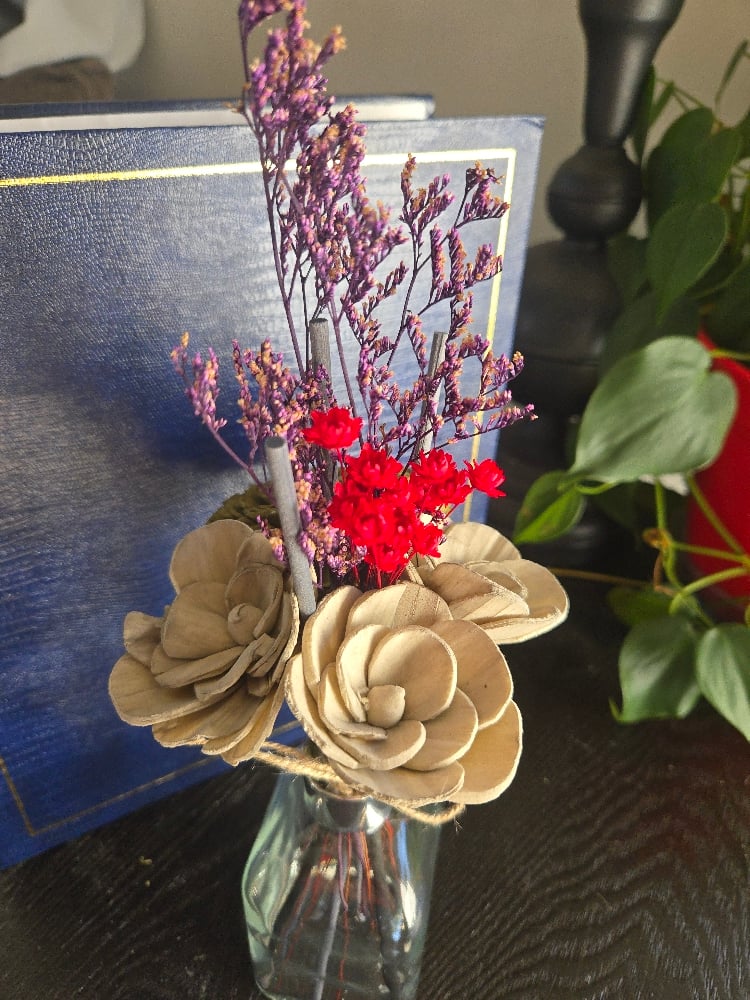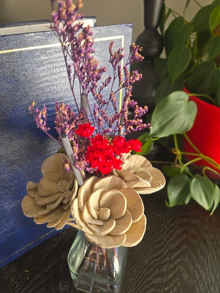 This set is stunning! Set with a large olive flower and 3 gray flowers, several gray reed sticks, red star flowers and purple caspia.