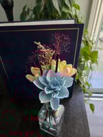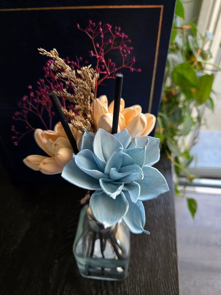 Peach and Sky Blue Magic! This set comes with 2 lush creamy peach dahlia blooms beside a delicate powder blue flower, topped with preserved brown caspia, purple baby's breath and several black reed sticks. This forever arrangement feels like a gentle sunset to dawn transition, simply gorgeous!