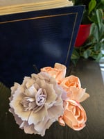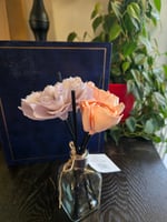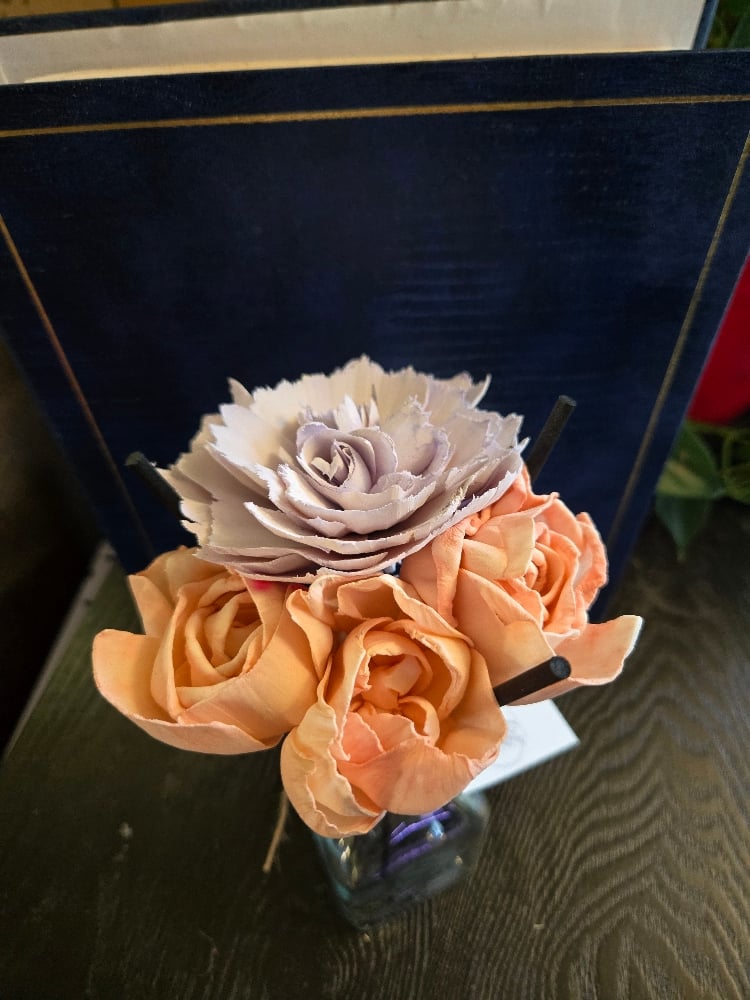 A large light purple paper like flower that comes with 3 peach roses and several black reed sticks! ✨️A simple and cute set that would look great in your home or office!