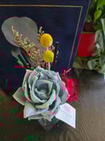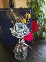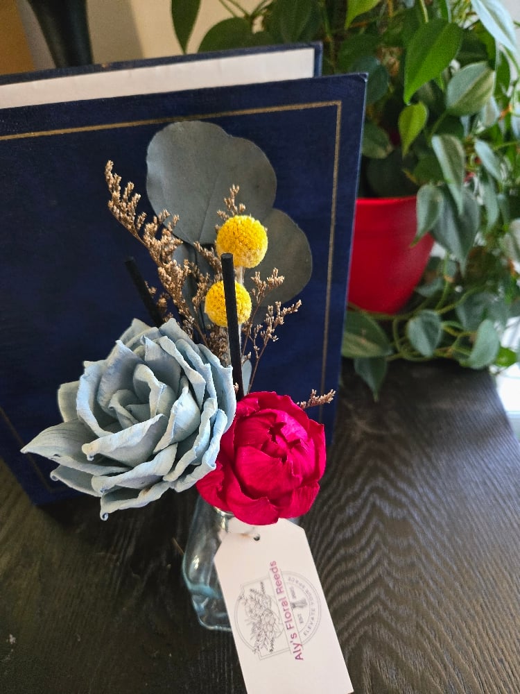 A large blue rose, set with 1 red roped peonys, set with preserved eucalyptus, caspia, yellow billy buttons and of course several black reed sticks. Act Fast, This one wont last long! ✨️An adorable set that would look great in your home or office!