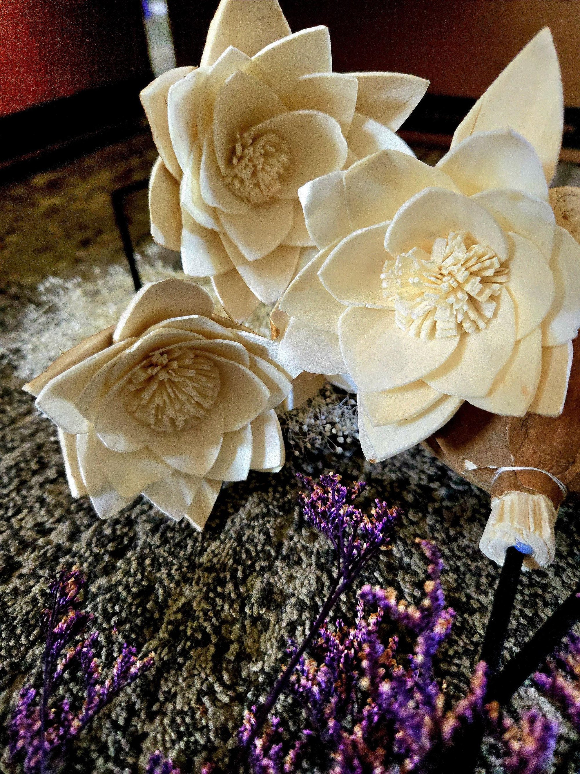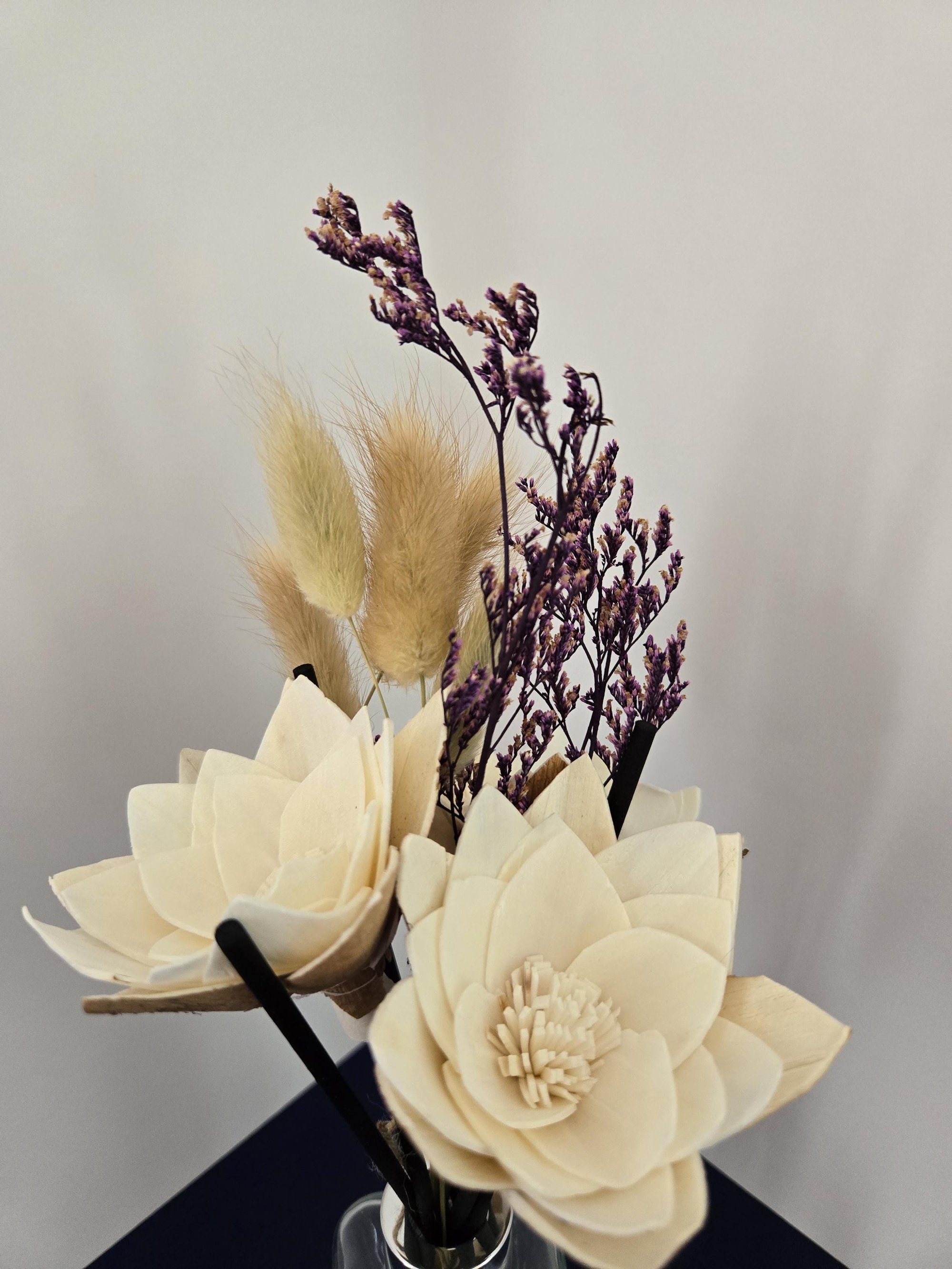 Handmade with 3 elegant water lily sola wood flowers, fluffy bunny tails, and delicate purple caspia and several reed sticks.