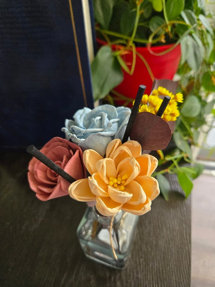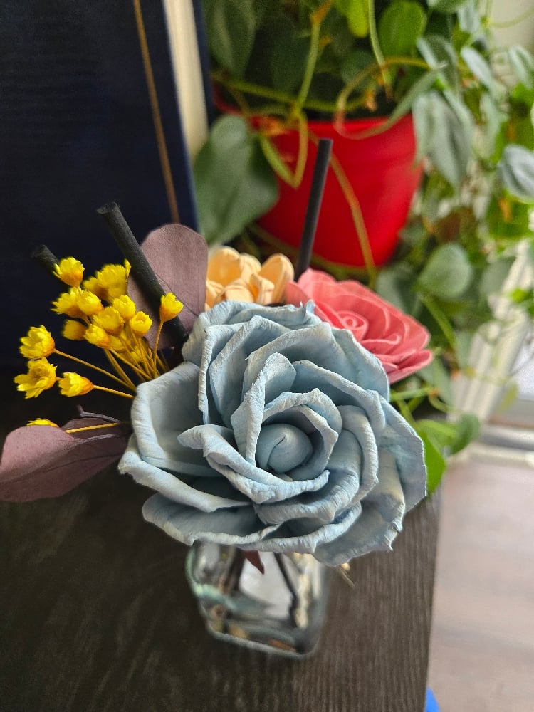Sunset escape reminds me of, well, a sunset! The large blue rose as the sky and the sun as the beaming yellow/peach crown jewel flower with unique yellow pearls on the inside. As the sun sets it, let's off beautiful colors, so I added a mauve rose and yellow star flowers and as night comes, that's where the preserved eucalyptus and black reed sticks join in. So pretty!