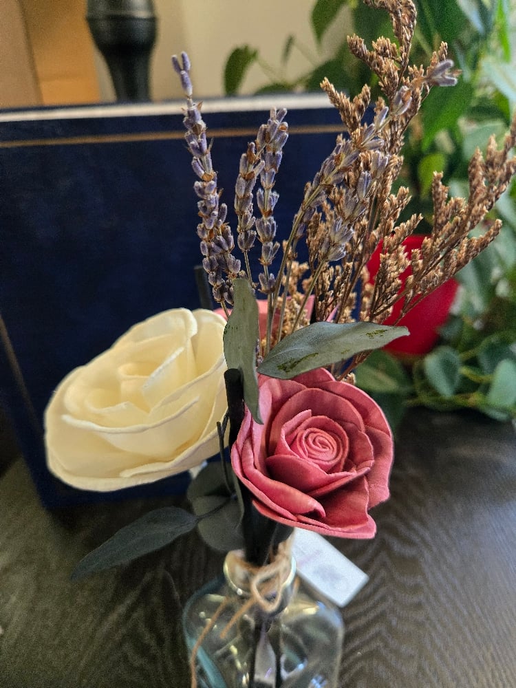 This beautiful white rose is a roped flower (more fragrance is produced) Set with 2 dark mauve roses. Beautifuly set with preserved caspia, lavender, eucalyptus and several reed sticks. ✨️