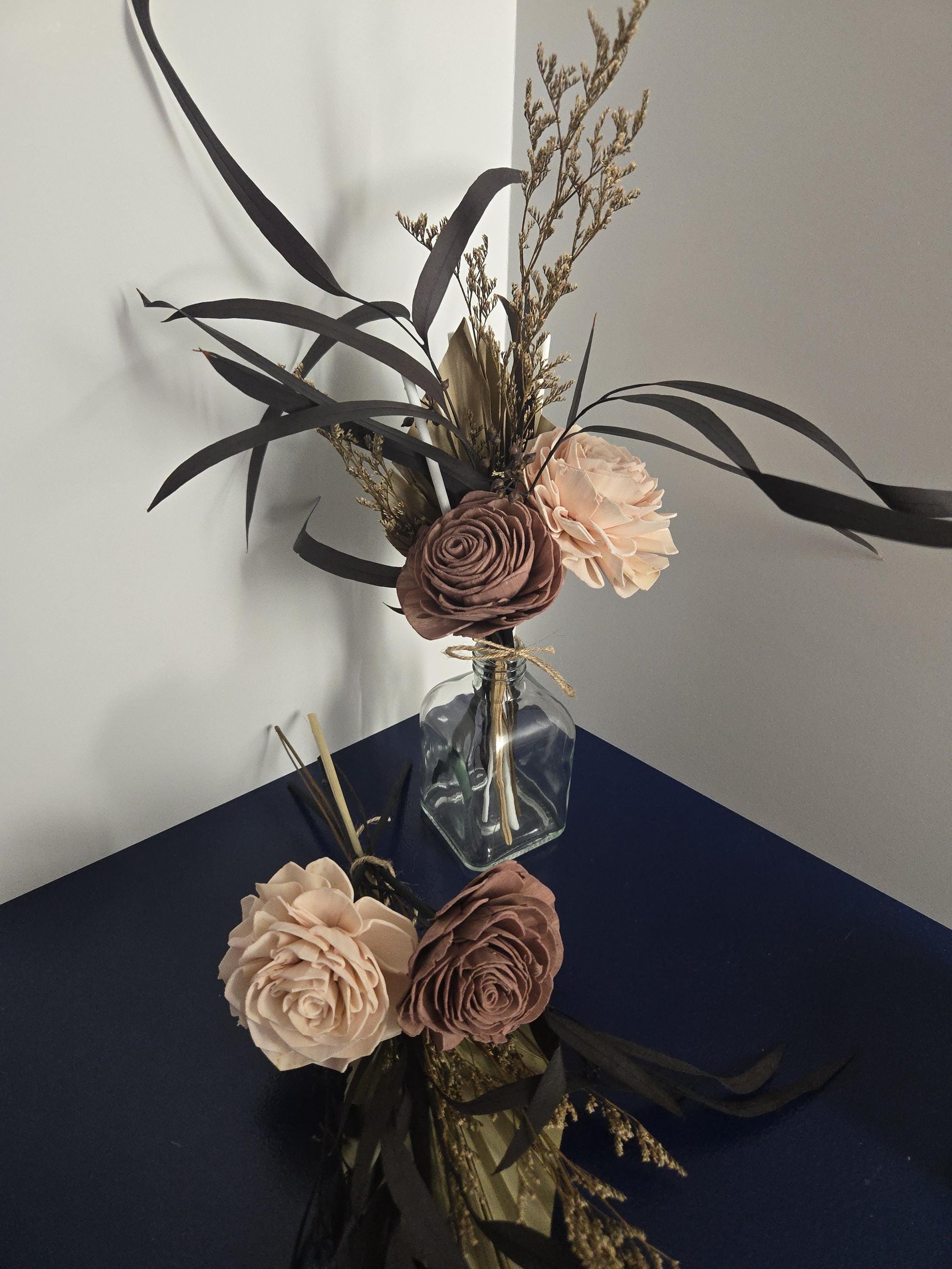 This beautiful set includes 2 rose buds, white caspia,a palm spear, seeded preserved eucalyptus and several reed sticks.