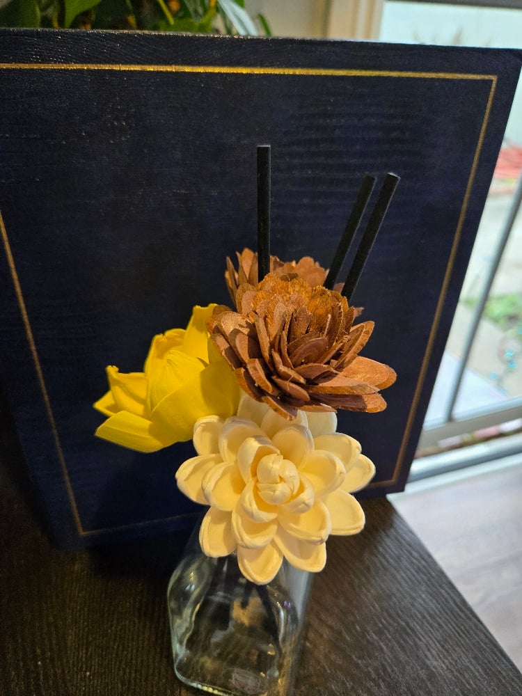 This set comes with a roped white crown jewel, 2 brown almond sliced roses and a yellow poppy flower and several black reed sticks. ✨️